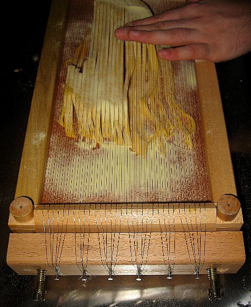 L'attrezzo (detto appunto chitarra) conferisce alla pasta uno spessore squadrato e una consistenza porosa che consente al sugo con cui verrà condita di aderire completamente, con grande soddisfazione del palato.